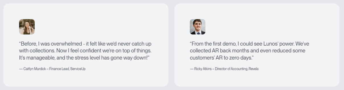 - Multi-System Integrations: Lunos connects ERP, CRM, email, and major payment systems like QuickBooks, NetSuite, Xero, Stripe, HubSpot, and Salesforce into one unified view.