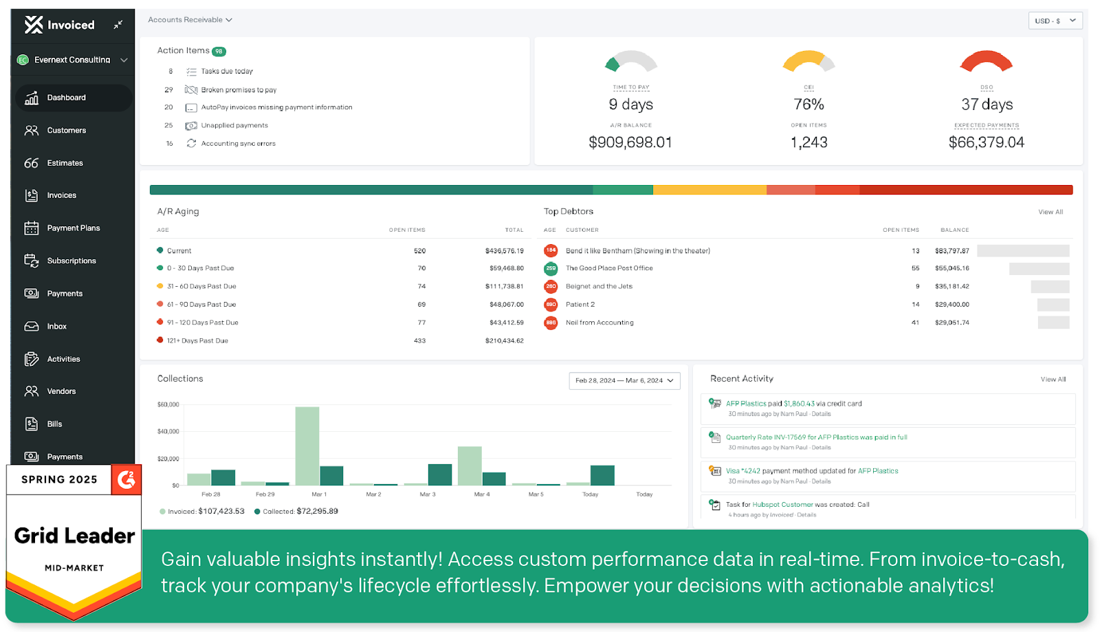 Invoiced rounds up our list. It’s an AR automation platform that handles invoice delivery, payment acceptance, automated collections, and more. The tool helps companies accelerate cash flow, gain insights into receivables, and reduce manual finance workload.