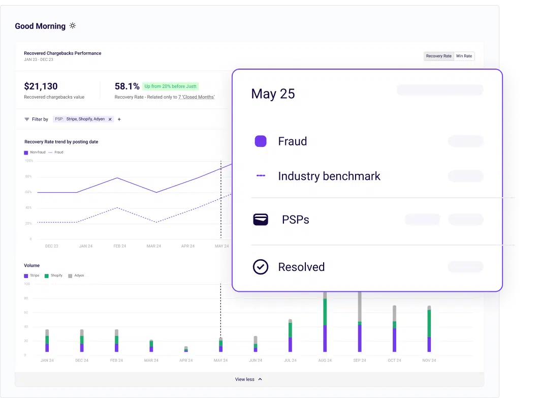 - Provides detailed reports on win rates and dispute percentages to help you understand your risk