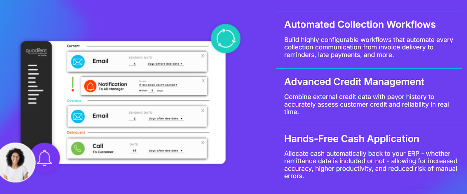 - Drives materially faster payments with intelligent, personalized follow-ups tailored to each customer’s behavior.