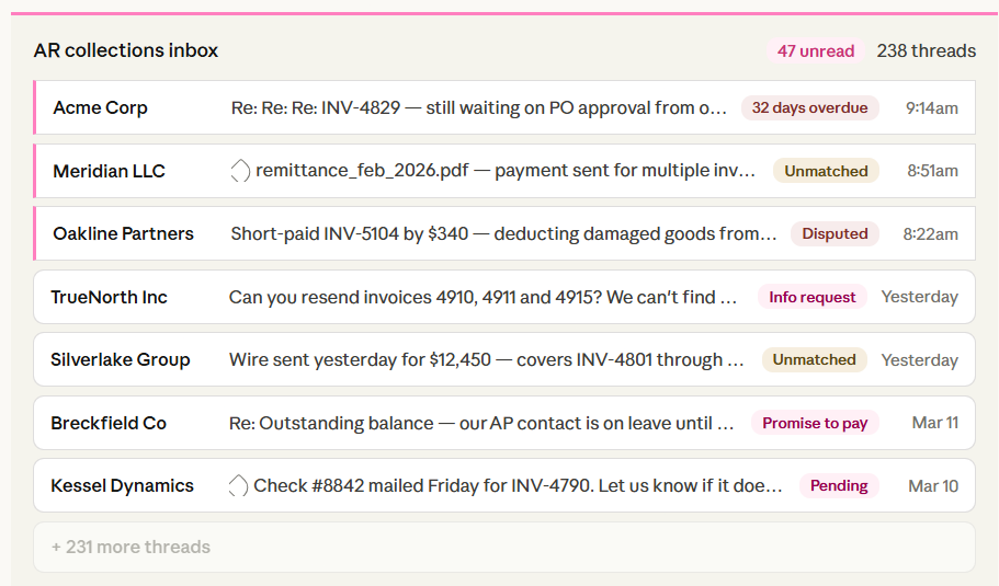 As an AI coworker, it understands the context of a payment, manages two-way conversations to clear up discrepancies, and handles the repetitive matching that usually stalls your workflow.