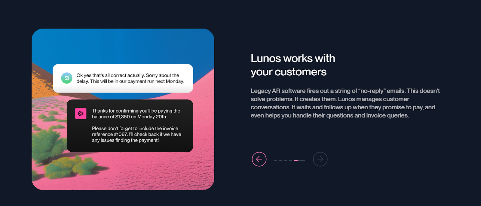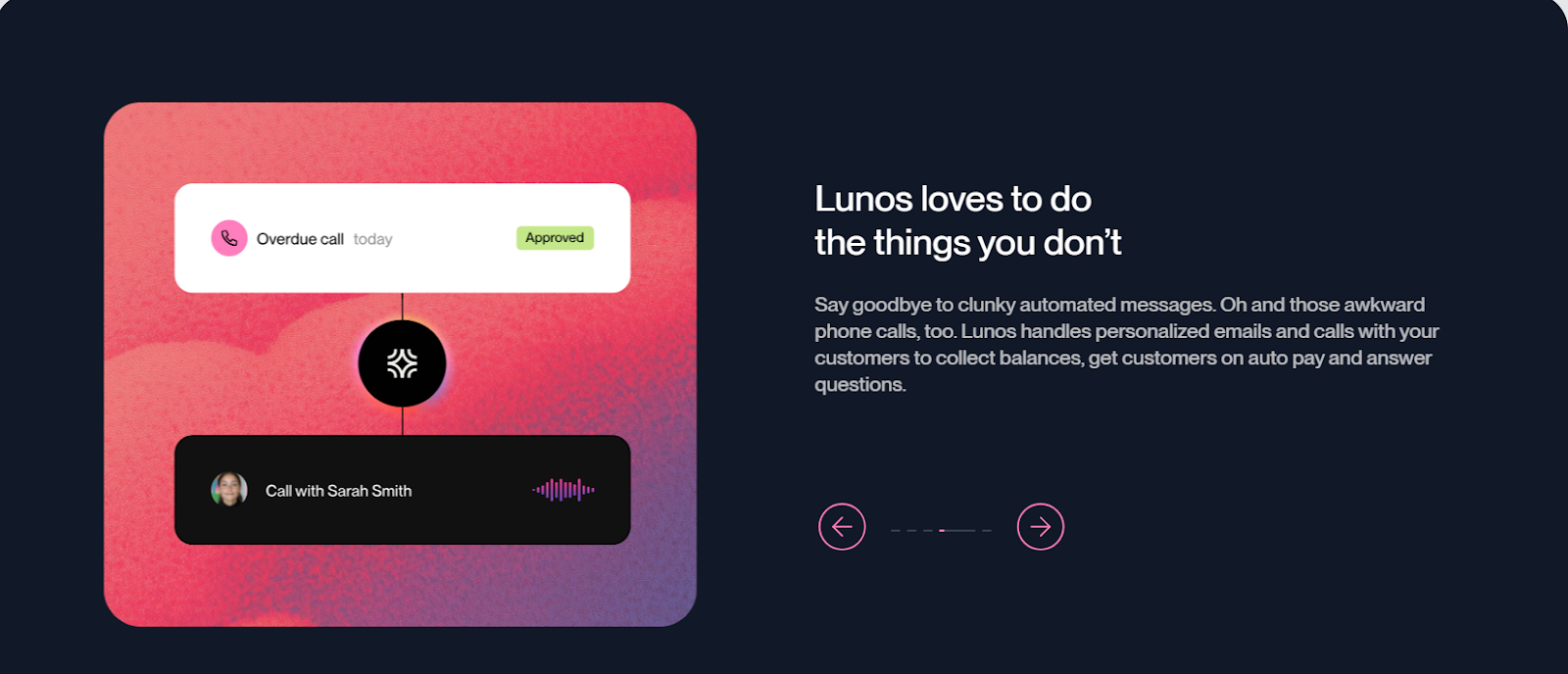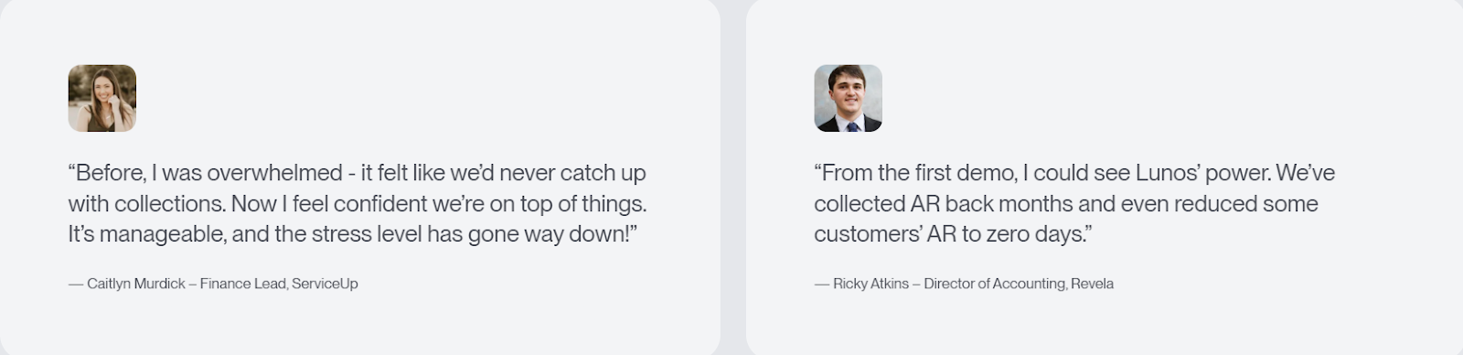 Lunos acts as the tireless teammate who wrangles the repetitive work, tracks every promise, and frees you up to focus on strategy and the tough calls. Cash comes in faster, your team finds its footing, and the cycle stays tight even as your business blazes new trails.