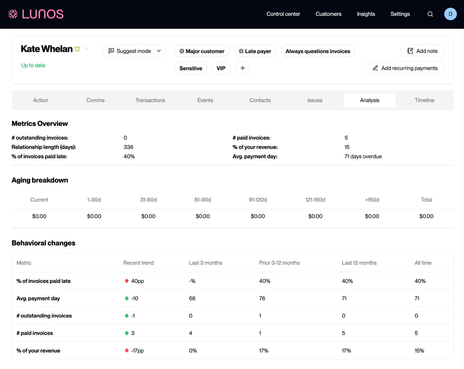 Lunos's Insights Lab reinforces this visibility with real-time access to key collection metrics. Teams can track AR aging summaries, collections over time, average days overdue when paid, and average days to paid without pulling manual reports or reconciling data across systems.