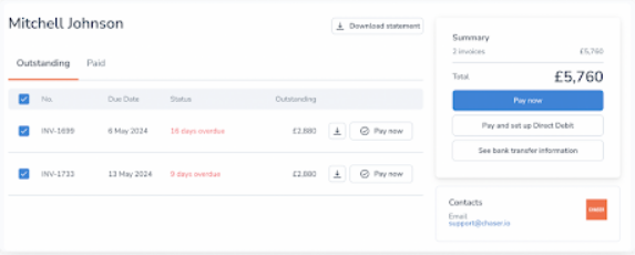 - Customer portal: Lets clients pay invoices online, and manage their billing history.